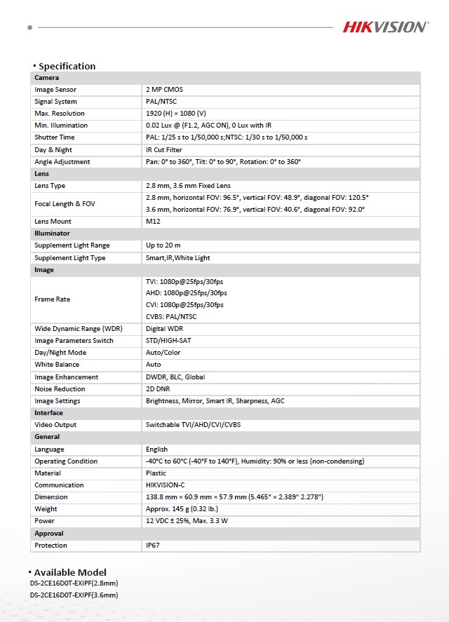 - 2.8 mm, 3.6 mm fixed lens