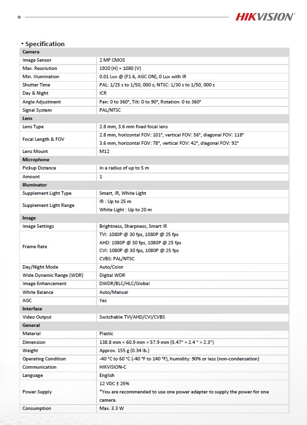 - 2.8 mm, 3.6 mm fixed focal lens